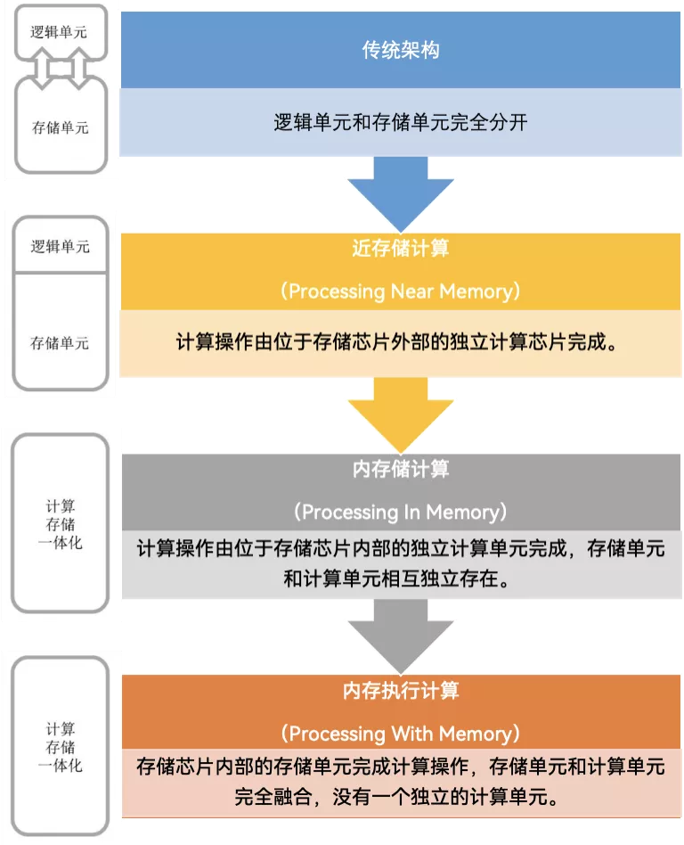 阿里達摩院告訴筆者,就目前和未來的趨勢來看,存算一體芯片分為近存儲計算(Processing Near Memory)、內存儲計算(Processing In Memory)、內存執行計算(Processing With Memory)三種技術路線。