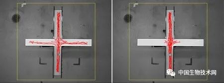 紅線表示小鼠移動的路徑。左圖:沒有4EPS的小鼠探索整個新區域。右圖:存在4EPS的小鼠只會待在新環境中的覆蓋區域,這表明了它們的恐懼或焦慮