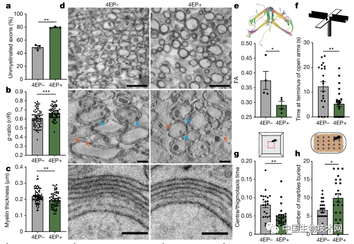 研究人員觀察到,在存在4EPS的情況下,少突膠質細胞的成熟度較低,因此產生的髓鞘較少,導致軸突周圍的絕緣層變薄,從而出現動物焦慮行為。