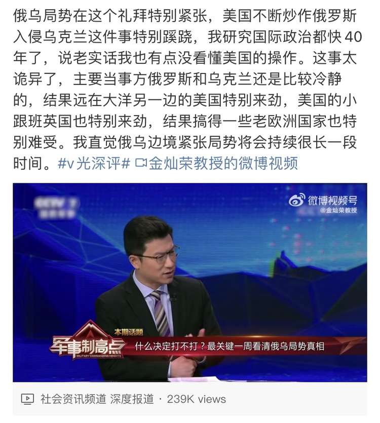 金燦榮教授,日前在社交網絡上發文,他認為,俄烏邊境緊張局勢將會持續很長一段時間。