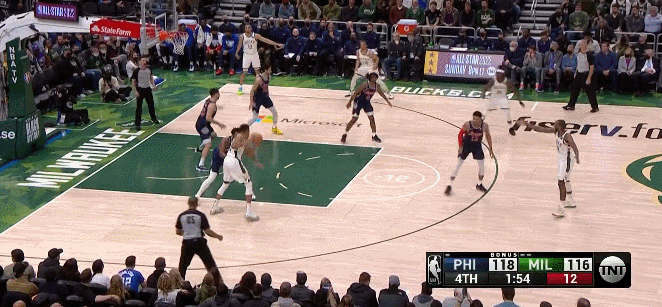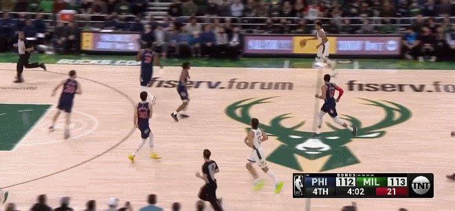 第四節還剩3分57秒,字母投進反擊三分,雄鹿116-112領先費城4分,當時看起來局面一片大好。
