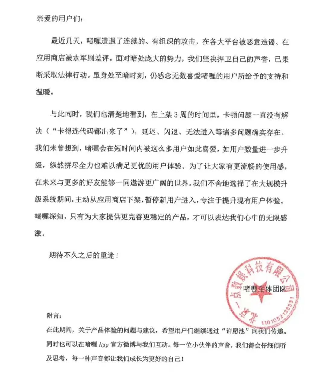 人紅是非多,與人氣暴漲相伴,啫喱App也招來了麻煩。一則“啫喱App存在使用用户微信號、QQ號等隱私信息”的消息在社交平台發酵。隨後,啫喱App官微認定上述消息為“謠言”,並選擇報警。2月13日,啫喱官方發佈公開信稱,近日受到“連續的、有組織的攻擊”,App將主動下架,暫停新用户註冊,對軟件確實存在的卡頓、延遲等問題進行完善。