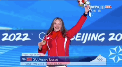 🟧 2022年北京冬奧會,谷愛凌獲得自由式滑雪女子大跳台冠軍,在最高領獎台上手捧絨線花束。圖源快手@冬奧賽事