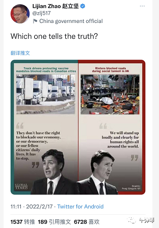 以至於外交部發言人趙立堅,就轉發對比照這樣説,到底哪個才是真相。