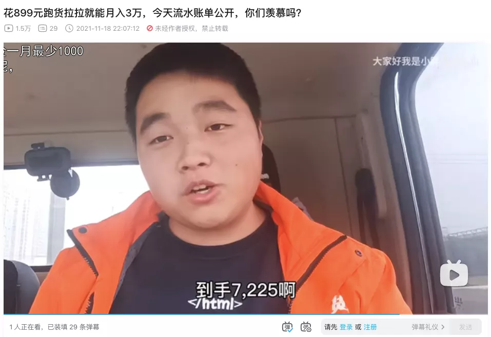 而針對貨拉拉“899元開通超級會員月入3萬”的傳言,在某視頻網站上,一位身在杭州的年輕貨運司機(自有車、有經驗)通過身體力行的方式驗證,開通899元/月的超級會員服務後,一個月的流水大概在1.1萬元,刨去加油費、餐食費、高速費、會員費等開支後,當月實際到手收入在7200元左右。