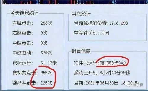 從下圖中的統計界面可以看到,這名被監控的設計師鼠標每個鍵點擊多少次,鍵盤敲擊多少次,甚至是鼠標位置和軟件運行時間,通通都被老闆盡收眼底。