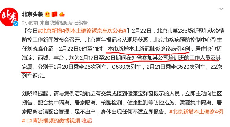 結果今天上午11點,北京就公佈了新增4名新冠陽性病例,居住地包括海淀、西城、豐台,也都是2月17日-20日期間在外省參加了某公司培訓班。
