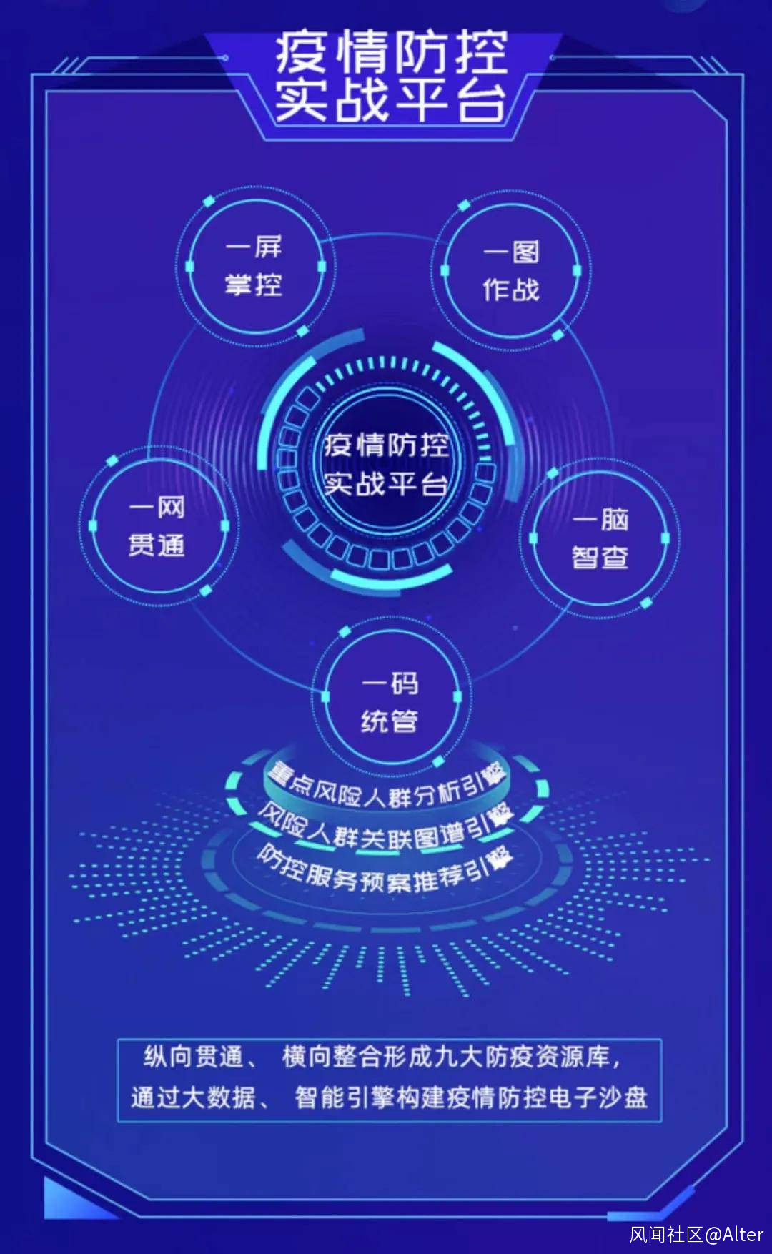 底層架構是一個大數據平台和9大防疫資源庫,匯聚了衞健、公安、交通、通管、民政等多個部門的數據,通過對這些數據的採集、治理、聚類、整合、分析,可以針對重點人羣構建一份準確的個人防控檔案。