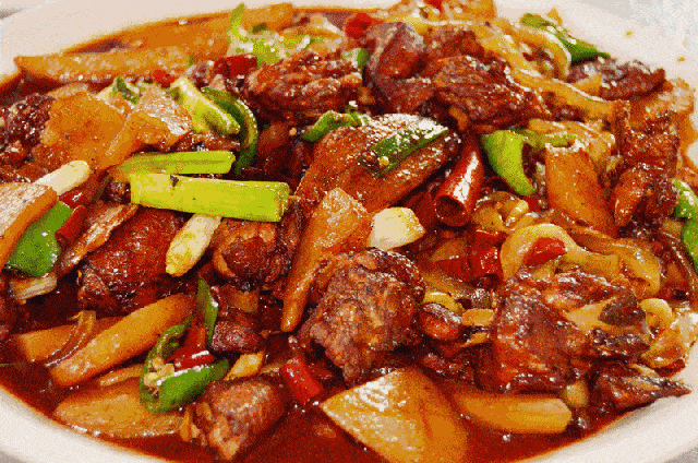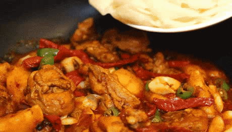 所有食材在加入調味料並經過高温翻炒後,加水燜置,各個食材的口味互相滲透,湯汁更富誘人色澤,冗雜着香和辣,大盤雞的美味沒有哪個新疆人拒絕得了。