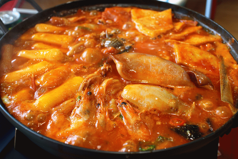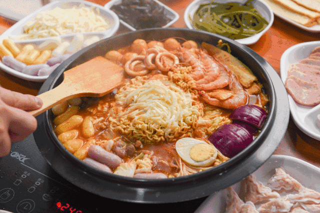 在扁平的鍋裏鋪上一層蔬菜,再放進雞翅、肥牛、午餐肉、蝦、蟹棒、鵪鶉蛋、丸子、紫薯球等;還有最重要的年糕和泡麪。放入秘製鹹辣醬、海苔、芝麻和小米椒,在食材表面撒滿芝士碎,倒入水,開火慢慢煮。