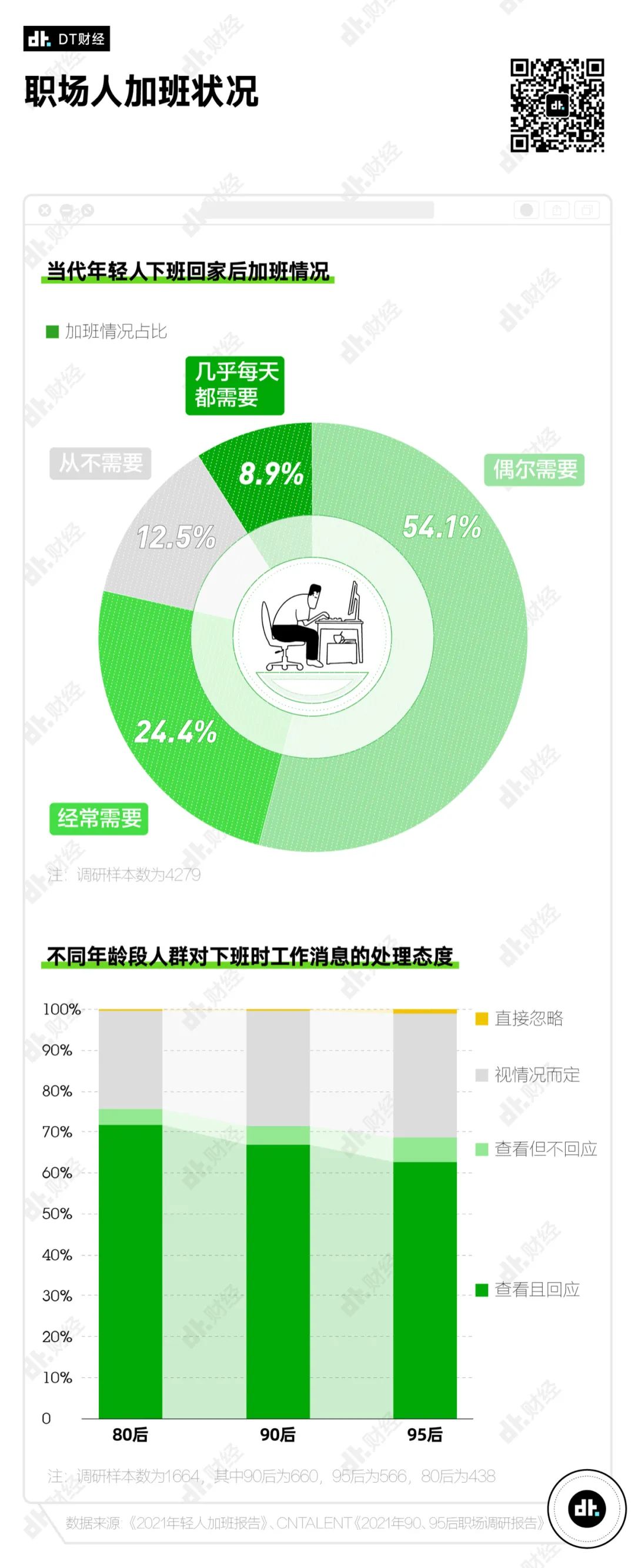 根據後浪研究所《2021年輕人加班報告》,僅有12.54% 的受訪者表示下班回家後從不需要加班。超過6成人,會在下班後會回覆工作消息。