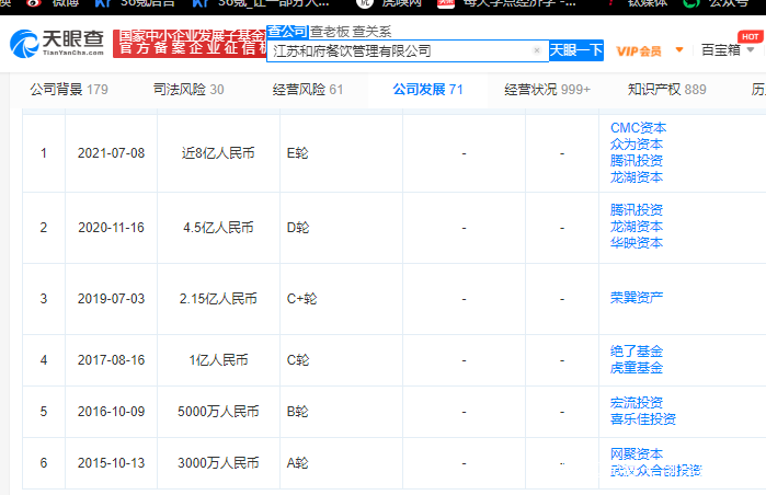 2021年7月,和府撈麪宣佈完成近8億元E輪融資,由CMC資本領投,新股東眾為資本、老股東騰訊投資、Longfor Capital跟投。