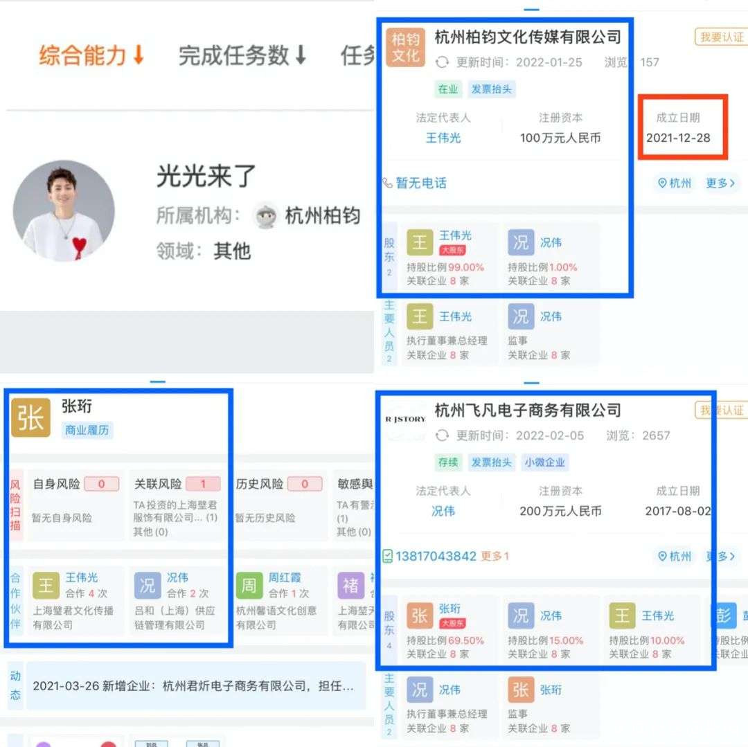 光光來了直播間所屬機構為杭州柏鈞文化傳媒有限公司,王偉光為公司法定代表人,持股比例達99%。另一股東為況偉,持股比例為1%。