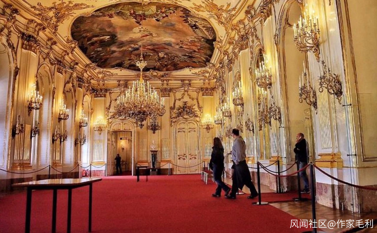 講解員帶着進去,首先就是富麗堂皇,滿滿水晶吊燈的宴會廳,據説當時天花板一片空白,特蕾莎請來畫家,要求畫一幅恢弘鉅作。畫家跟國產的慈禧旁邊的李蓮英,也沒什麼區別,在上面畫了無數象徵,什麼拿着稻子的農夫寓意豐收,帶着賬本的銀行家寓意財富,拉着小提琴的音樂家寓意才華……
