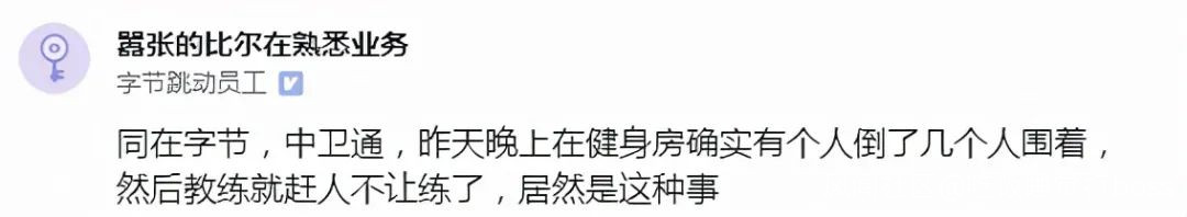 認證字節跳動員工的一位網友則表示:出事是在知春路中衞通,昨天晚上在健身房確實有個人倒了幾個人圍着,然後教練就趕人不讓練了,現在才知道,原來是這種事。