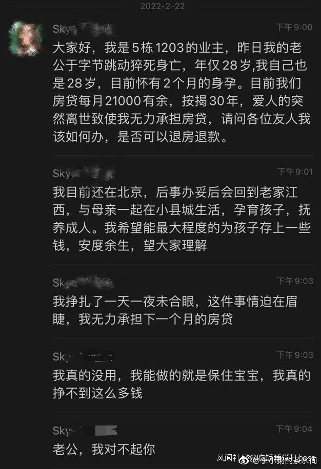 大家好,我是x棟12xx的業主,我的老公叫吳x,視頻架構部門的圖像算法工程師。昨日我的老公於字節跳動猝死身亡,年僅28歲,我自己也是28歲,目前懷有2個月的身孕。目前我們房貸每月21000有餘,按揭30年,愛人的突然離世致使我無力承擔房貸,請問各位友人我該如何辦,是否可以退房退款。
