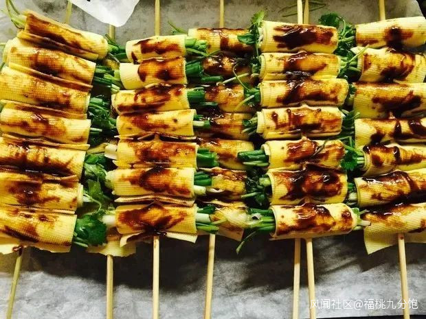 **切段的香菜裹在豆腐皮裏,經過木炭煙熏火燎後帶着誘人香味,辣椒孜然助力後,寡淡的豆腐皮都煥發新生。**畢業臨行的最後一晚,我和大學最好的朋友去要了20串,吃的臉都綠了,但是想到再也吃不到了,還是全部嚥下去了。