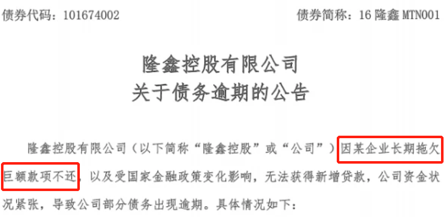 但是塗建華始終沒説究竟是誰欠錢不還,隆鑫的公告裏也只敢寫是“某企業”。