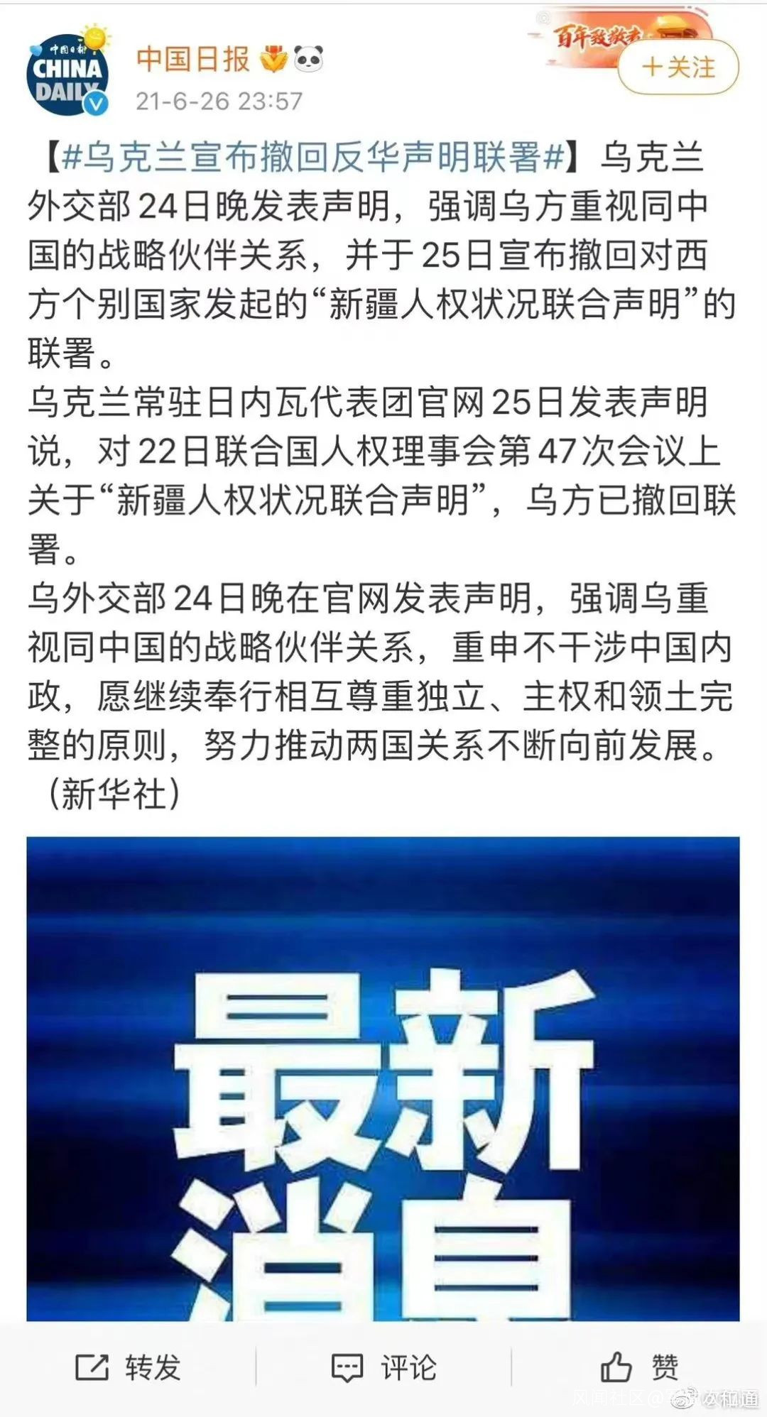 今天上午這則新聞又刷屏了,在這個要緊關頭,烏克蘭撤回反華聲明,不敢再得罪中國,聽着好像很解氣,但這個消息也是不對的,準確來説是亂了時間線。