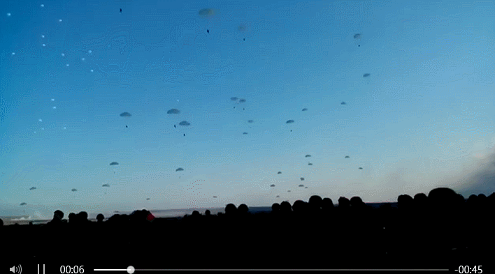 網上流傳的這則視頻稱俄軍空降兵部隊正在哈爾科夫地區大規模空降,非常壯觀。有網友看了這則視頻還編出了段子:“目前歐洲東部天氣晴好,基輔上空有少許高雲,無降水,風力不大,部分地區下俄羅斯人。”