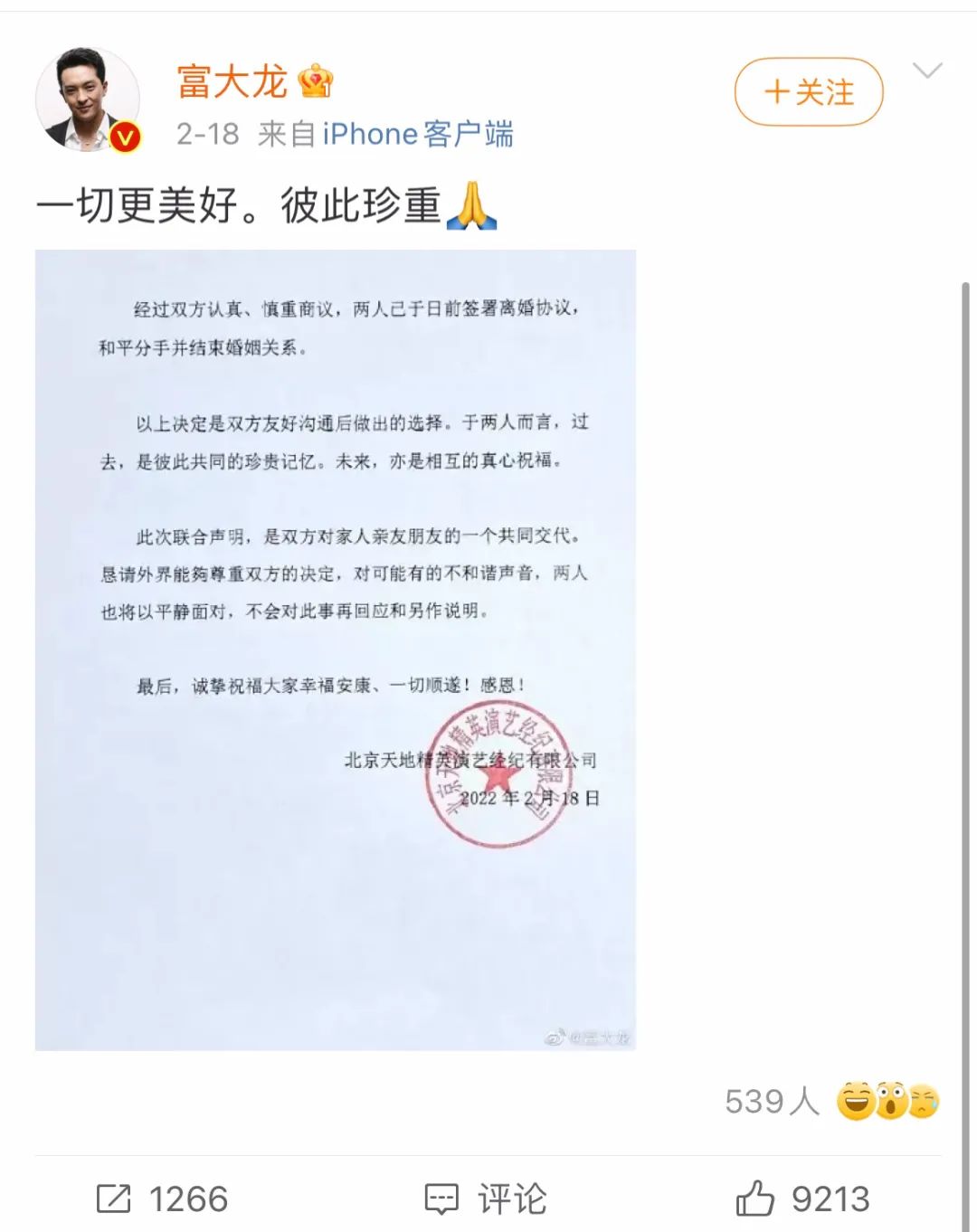 2月18日,他與妻子饒敏莉共同發表聲明宣佈離婚,並祝願對方:“一切更美好,彼此珍重”。