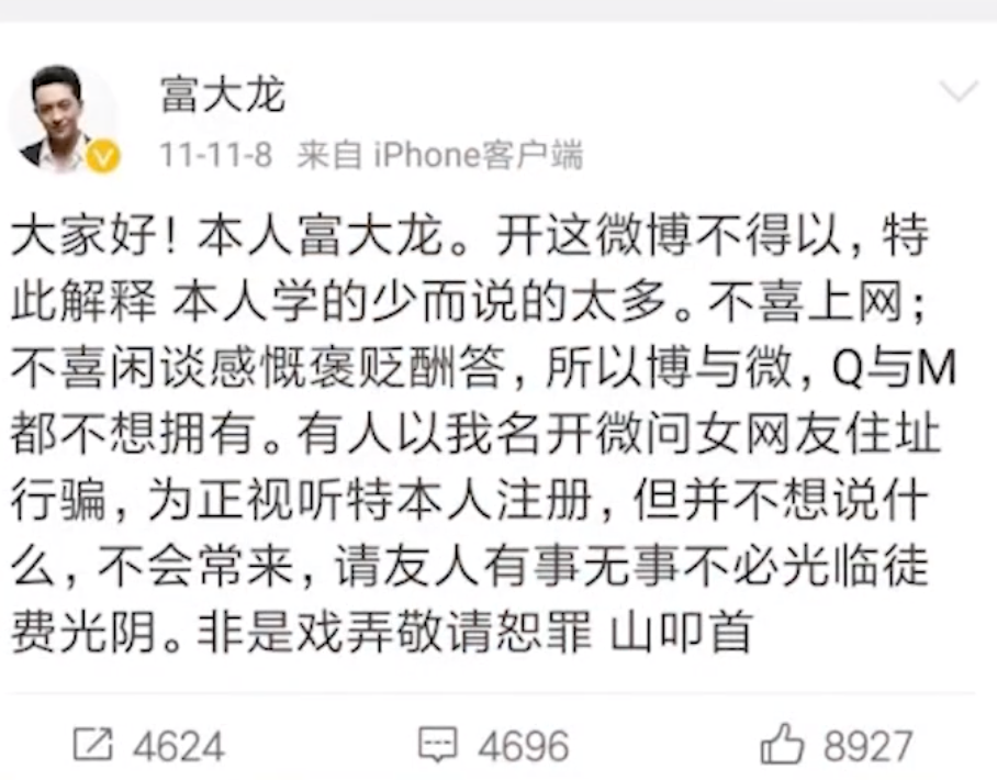 就連註冊微博賬號,富大龍都是為了提醒網友不要被網絡上的假號詐騙。