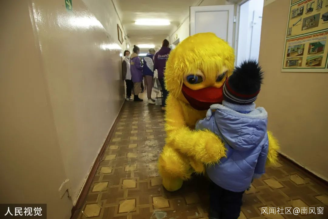 2月20日,在俄羅斯羅斯托夫一處安置點,接收了千名烏克蘭東部地區疏散來的難民。孩子、婦女和老人先行抵達,一個孩子被扮成卡通人偶的志願者抱着,這裏還有同伴和食物,他們一起做着手工,一個小女孩瞥到鏡頭,還是大方地微笑。