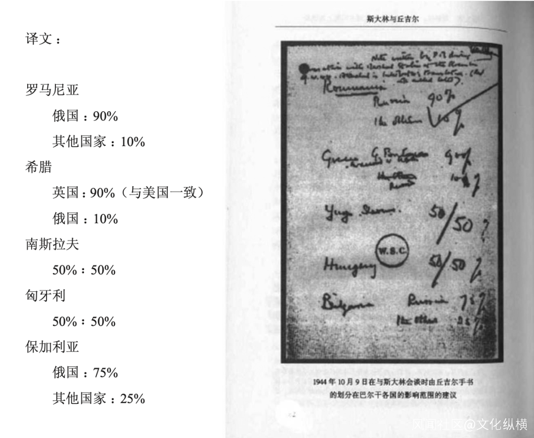 (1944年10月9日在與斯大林會談時由丘吉爾手書的劃分在巴爾幹各國的影響範圍的建議)