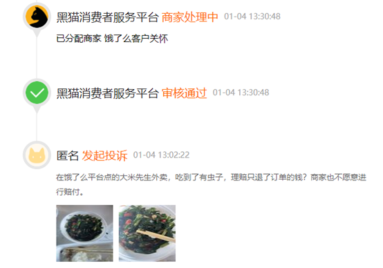 除此之外,《港灣商業觀察》翻閲黑貓投訴發現,投訴問題大多集中在食品安全以及服務態度上。有用户表示,吃出蟲子,圖書釘,毛,兒童餐裏的雞腿變質骨頭黑色等,除此之外,還有用户表示,服務態度差,遇到問題推脱不承認,並私下找到顧客地址進行騷擾,客服不理人等問題。