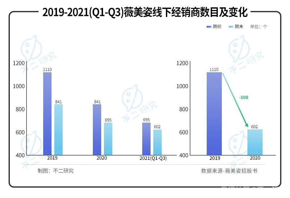 另一方面,薇美姿的線下經銷商數目也出現了較大變動。據招股書顯示,2019-2020年及2021前三季度,期末線下經銷商數目分別為841名、695名和602名,兩年九個月線下經銷商數目驟降508名。