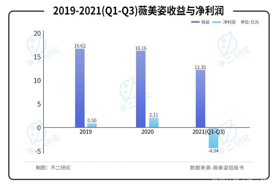 據招股書顯示,2019-2020年及2021前三季度,薇美姿收益分別為16.62億元、16.16億元和12.30億元;淨利潤分別為0.50億元、2.11億元和-4.94億元。