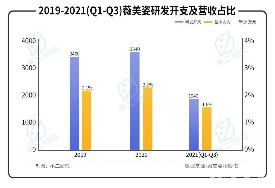 從研發收入上看,2019-2020年及2021前三季度,薇美姿的研發開支分別為3460萬元、3540萬元和1940萬元,佔總營業收入的2.1%、2.2%和1.6%。