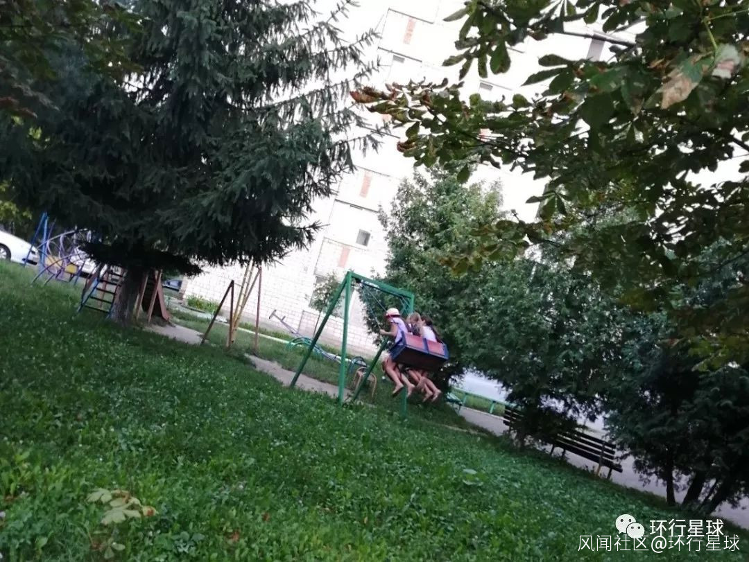 開放式的小區裏,兩個小女孩在玩鞦韆