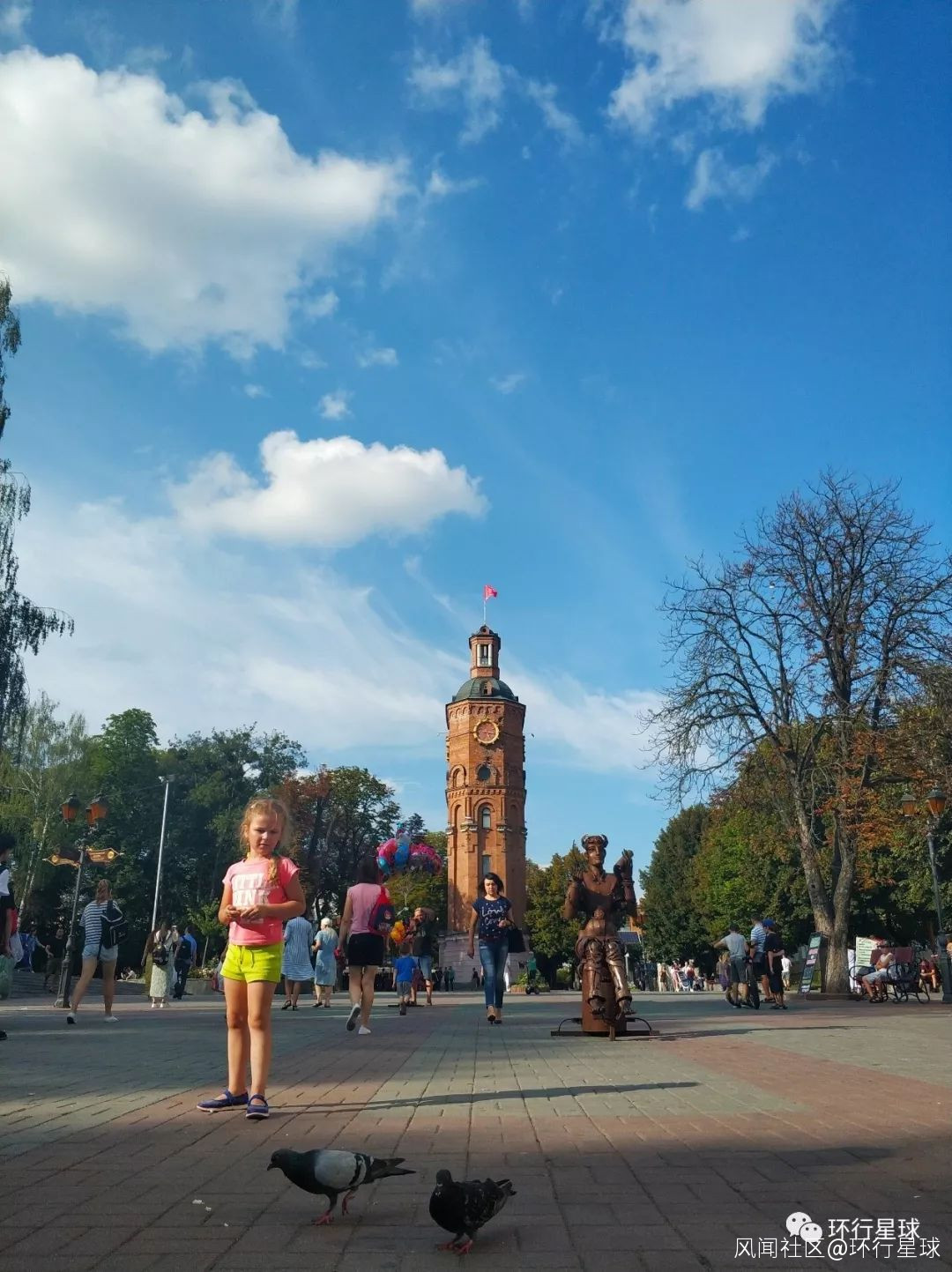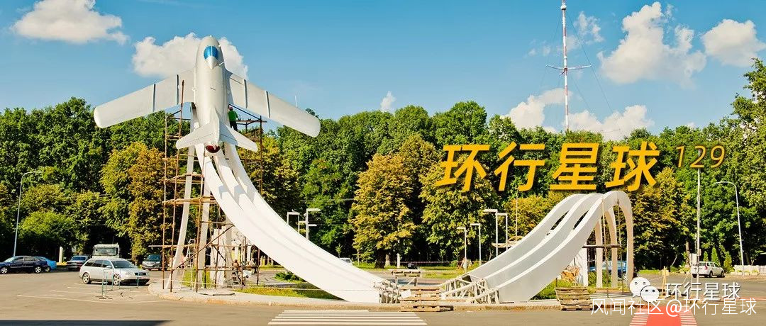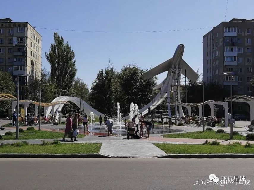 回來的路上路過了路邊的一個噴泉廣場,大家都在乘涼、玩耍,後面是紀念蘇聯飛行員的環形雕塑。