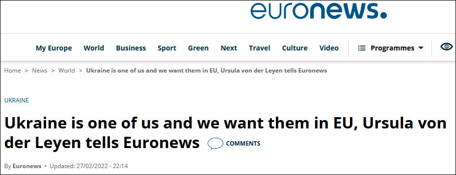 2月27日,歐盟委員會主席馮德萊恩在接受歐洲新聞電視台採訪時表示,“烏克蘭是我們中的一員,我們希望烏克蘭加入歐盟”。