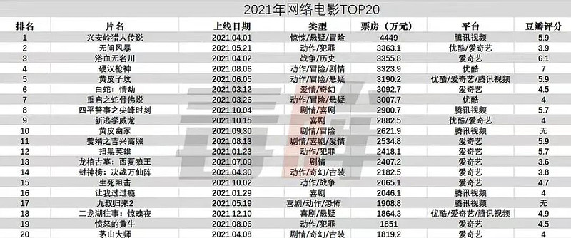 整體來看,行業正在提質減量。在2021年,網絡電影上新量同比下降了28%,但每部平均的有效播放量同比增長了37%。楊向華和團隊也在推動和鼓勵頭部的片方慢下來,“我是每年春節前,都會約他們一對一的聊天。”