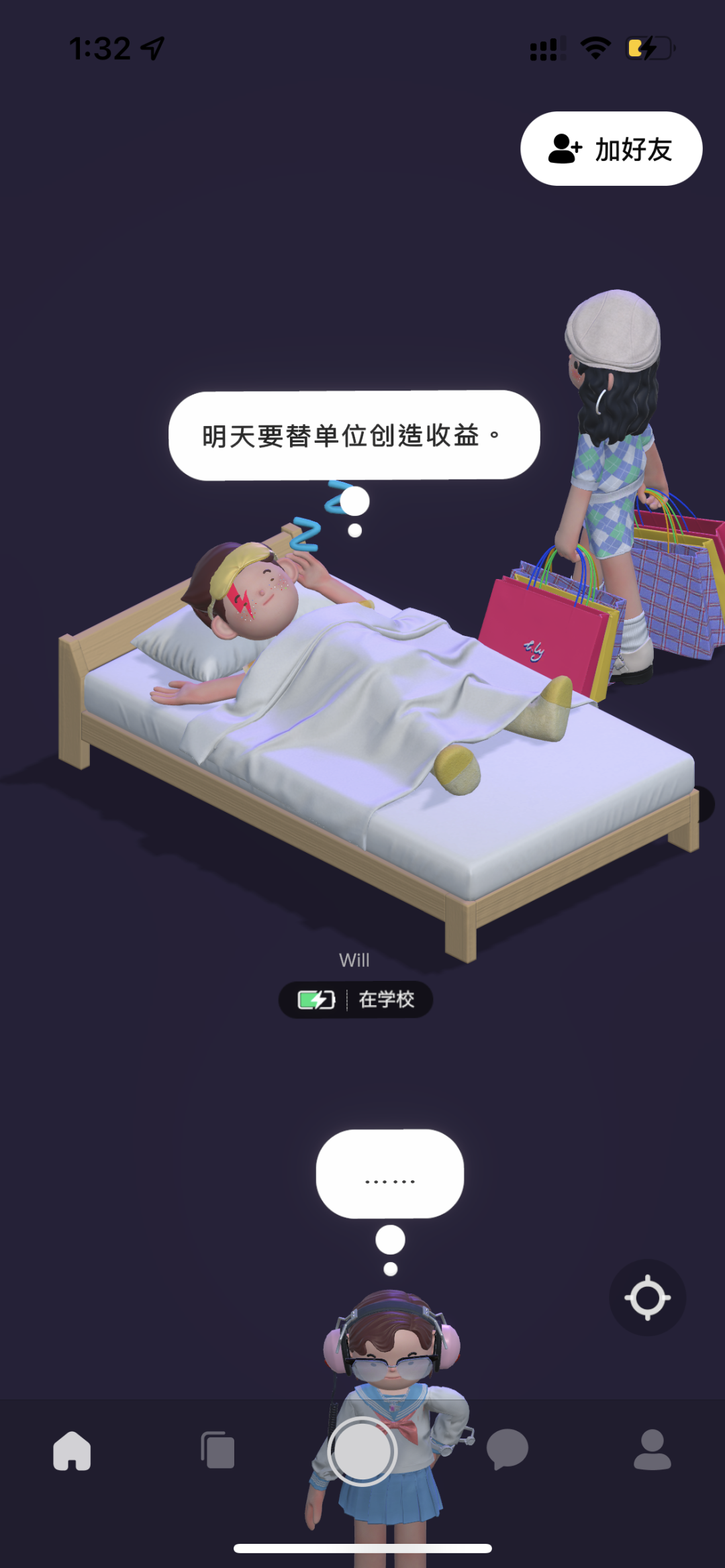 另外,它提供了相當簡單有趣的互動方式。加入啫喱的朋友們會出現在同一個“廣場”上。在這個廣場,你可以看到朋友們的虛擬形象,看到這些虛擬形象在做什麼和説什麼,甚至還能看到朋友本人的大致位置(如果雙方願意開放的話)和手機電量。想跟朋友互動的話,可以簡單地戳一戳對方的虛擬形象,對方將會在手機上收到一個提醒,也可以直接在後台的聊天窗口發起對話。
