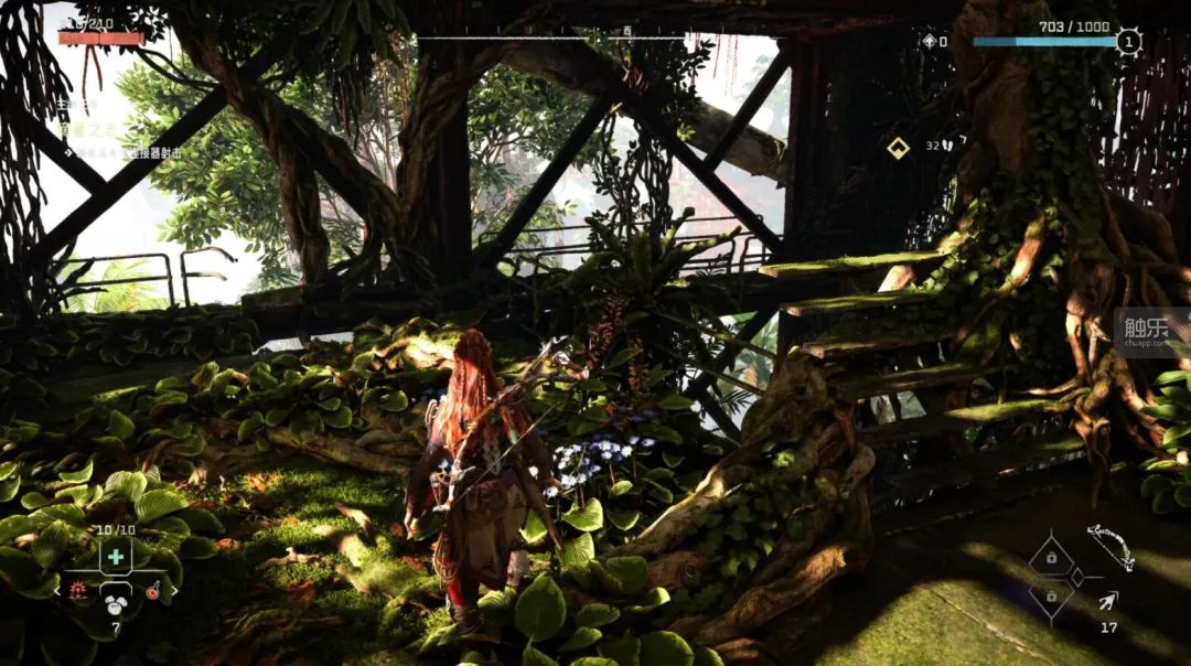 在部分場景中,這種高度細節幾乎會讓我目眩。像是在進入開放世界前的一小段“新手村”劇情中,玩家需要在一片密林裏利用可攀爬障礙上躥下跳,它們卻都隱藏在真實且細節豐富的樹叢、灌木、藤蔓中,難以察覺。理論上説,這的確是《地平線:西之絕境》設計的一部分,它甚至有個“隱藏一切引導”的功能,用R3鍵掃描也能高亮顯示出可交互對象,不過這仍成為了我推進過程中的一個小小阻礙。