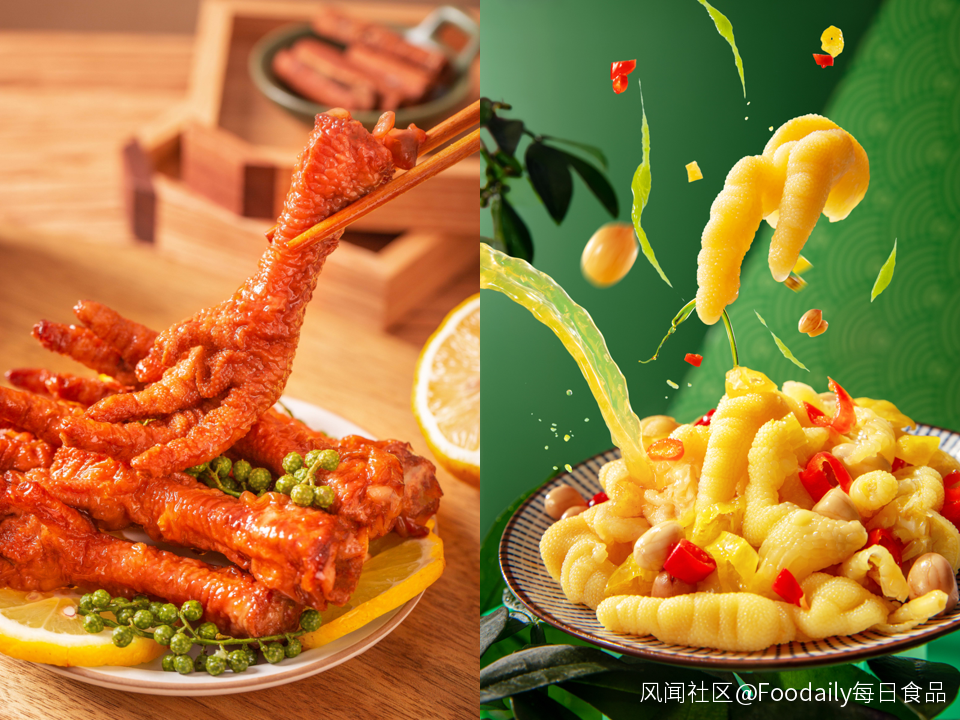 Foodaily觀察到,同樣是鳳爪,王小滷瞄準“追劇必備”、“粉面伴侶”等食用場景,抓住消費者對鳳爪去甲需求做產品差異化,推出“個大、肉多、沒指甲、易脱骨”的虎皮鳳爪;逗嘴首創非輻照鎖鮮技術,以無骨謎之鳳爪系列切入,鳳爪口味不設限,且能常温鎖鮮,改善傳統輻照工藝影響,相比傳統產品更營養。