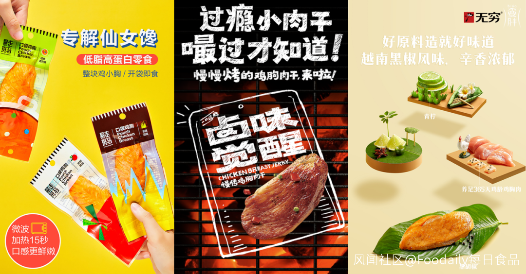 常温雞胸肉類產品因其高蛋白低脂肪的特點深受輕食愛好者青睞。暴走斑馬率先選用正大全產業鏈雞小胸,獨立包裝形式;滷味覺醒將雞胸肉鮮切成薄片,先滷後烤,最大化保留其低脂高蛋白的優點;無窮食品選用養足365天雞齡雞胸肉,先蒸後烘,121°C高温殺菌保鮮技術,鎖住新鮮美味···