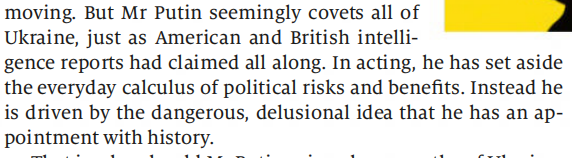 接下來為了樹立公信力,該文表示:“根據美國和英國情報機構報告顯示,普京似乎覬覦烏克蘭的全部領土。因為普京已經被自己和歷史有個約定這一幻覺所操縱了。”