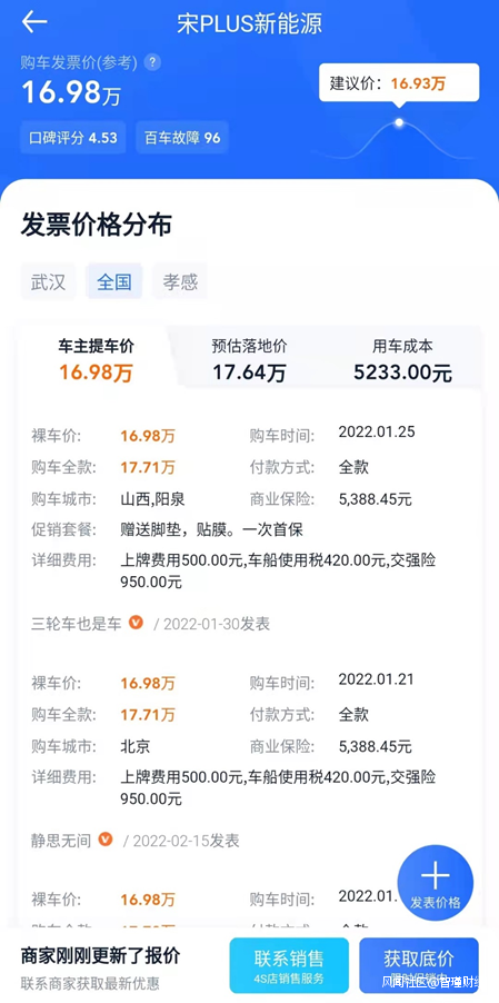例如,1月30日,汽車之家網友“三輪車也是車”發佈的提車明細顯示,2022年1月21日,其在北京購買的比亞宋PLUS新能源2021款 DM-i 110KM 旗艦PLUS裸車價16.98萬元,購車全款17.71萬元(含商業保險5388.45元,上牌費500元,車船使用税420元,交強險950元)。