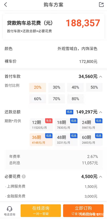 以比亞迪宋PLUS新能源2021款 DM-i 110KM 旗艦PLUS為例,瓜子二手車App購車方案顯示,全款裸車價17.28萬元(宣稱行業冰點價),貸款還款總額18.36萬元(宣稱門檻低,利率低),包括首付款34560元(首付20%),分36期還款,每期還4148元,必要花費4500元(上牌服務費1500元+金融服務費3000元)。