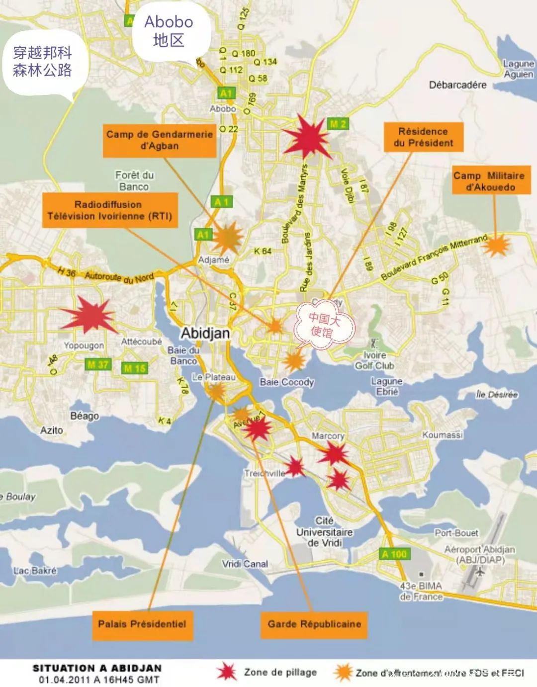 次日清晨,我請龐參來使館,商量如何解救另兩名LQ公司修理所受困人員。這兩人的居所位於Abobo區北部,那裏打得比較激烈,僱傭的兩名保安,一人出門時被打死,另一名失蹤,只剩下他們倆躲在宿舍裏不敢出來。我們決定當天上午趁交戰間隙,避開交火激烈的正面方向,由龐參和一秘老董帶人驅車從西面穿越邦科森林,直插Abobo北部進入戰區救人。這條路線沿途較偏僻,但大部分路段在政府軍控制下,相對較安全。HW公司冉經理自告奮勇,帶了兩名當地員工一同前往。他們通過幾道政府軍關卡到了Abobo北郊,再由兩名當地員工驅車進入“隱形突擊隊”佔據的市區,終於把LQ公司兩名中國工人帶出。