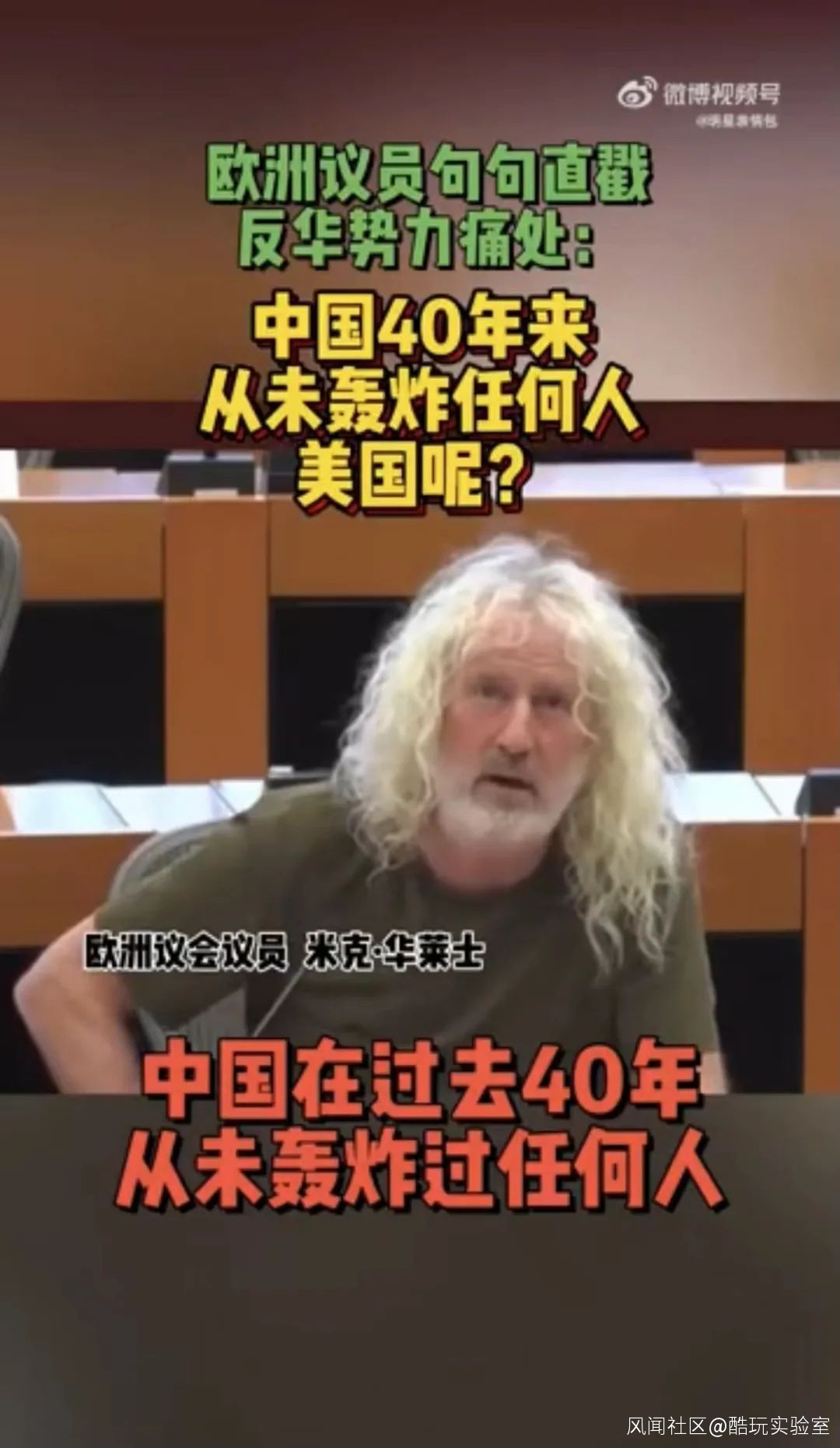 歐洲有位議員曾提出了一個問題:中國40年來,從未轟炸任何人。但在過去的200年裏,美國有多少年沒有打仗?