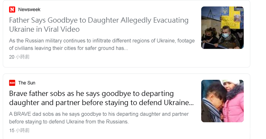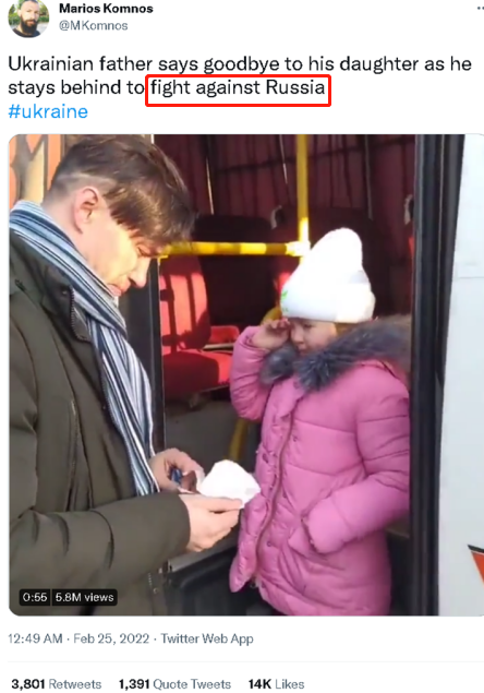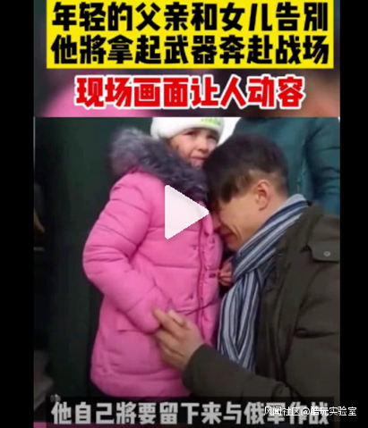 2月25日,一則標題為“一名烏克蘭父親在上戰場與俄軍作戰前,與女兒揮淚訣別”的視頻,更是刷爆了西方世界的新聞媒體和社交網絡,一度傳至中國。