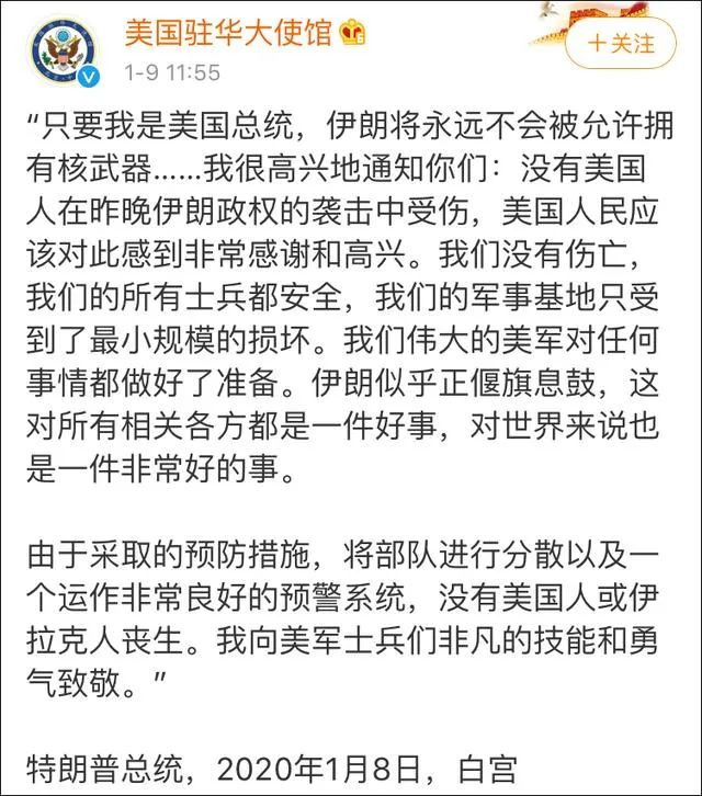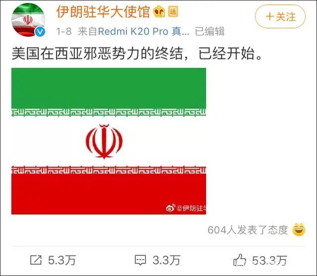 伊朗駐華大使館官方微博先聲奪人,以一句“美國在西亞邪惡勢力的終結,已經開始”打響輿論戰。
