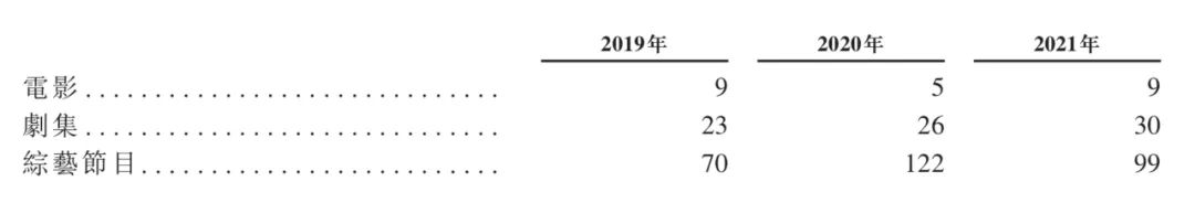 娛樂內容活動包括電影、劇集以及綜藝節目,管理團隊會為公司旗下藝人搭建可參演優質娛樂內容的機會。招股書顯示,2021年,公司簽訂旗下藝人出演電影的合同9份;劇集合同30份;綜藝節目合同99份。