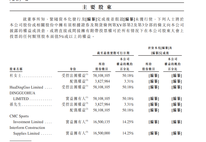 上市之前,公司創辦人兼董事長杜華持股50.18%,阿里影業通過Interform Construction Supplies Limited持股14.25%,字節跳動旗下公司量子躍動通過Afflatus Limited持股4.74%,華人文化通過CMC Sports Investment Limited持股14.25%。