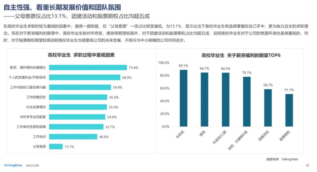 不可否認的是,勞動力人才就業時,薪資是第一考量點,但絕不是唯一考量點。TalkingData發佈的《2020年高校畢業生求職研究報告》顯示,高校畢業生求職過程的重視因素中,薪資確實排名第一,為75.4%,但是個人發展空間、興趣、行業發展情況等因素,同樣達到了50%以上。